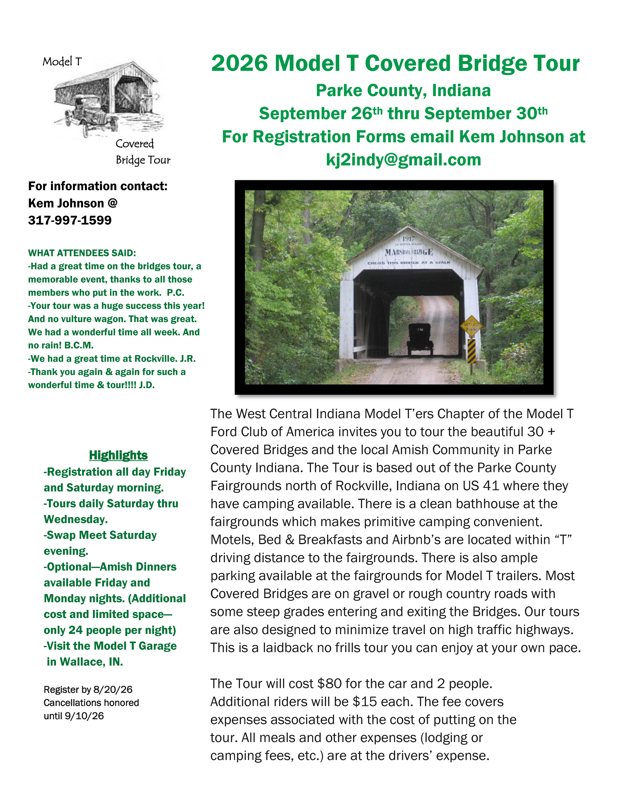 The West Centeral Indiana Model T'ers Chapter of the Model T Ford Club of America welcomes you to tour the beautiful 30+ Covered Bridges and the local Amish Community in Parke County Indiana. The tour is based out of the Parke County Fairgrounds, North of Rockville, Indiana on US 41 where they have camping available. There is a clean bathhouse at the fairgrounds which makes primitive camping convenient. Motels and Bed & Breakfasts are located within "T" driving distance to the fairgrounds. There is also ample parking available at the fairgrounds for Model T trailers. All tours are designed to drive on country roads (some gravel) to minimize high traffic highways.